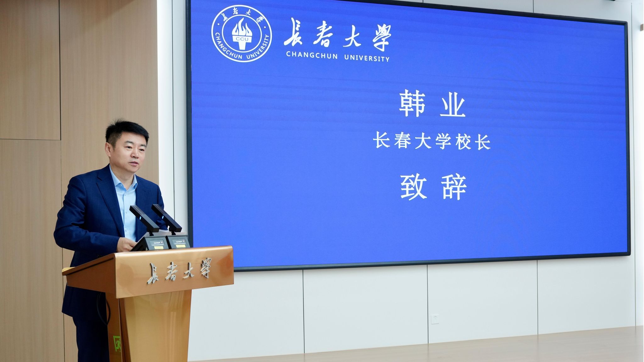 韩业与刘琦共同为长春大学体育学院揭牌。
